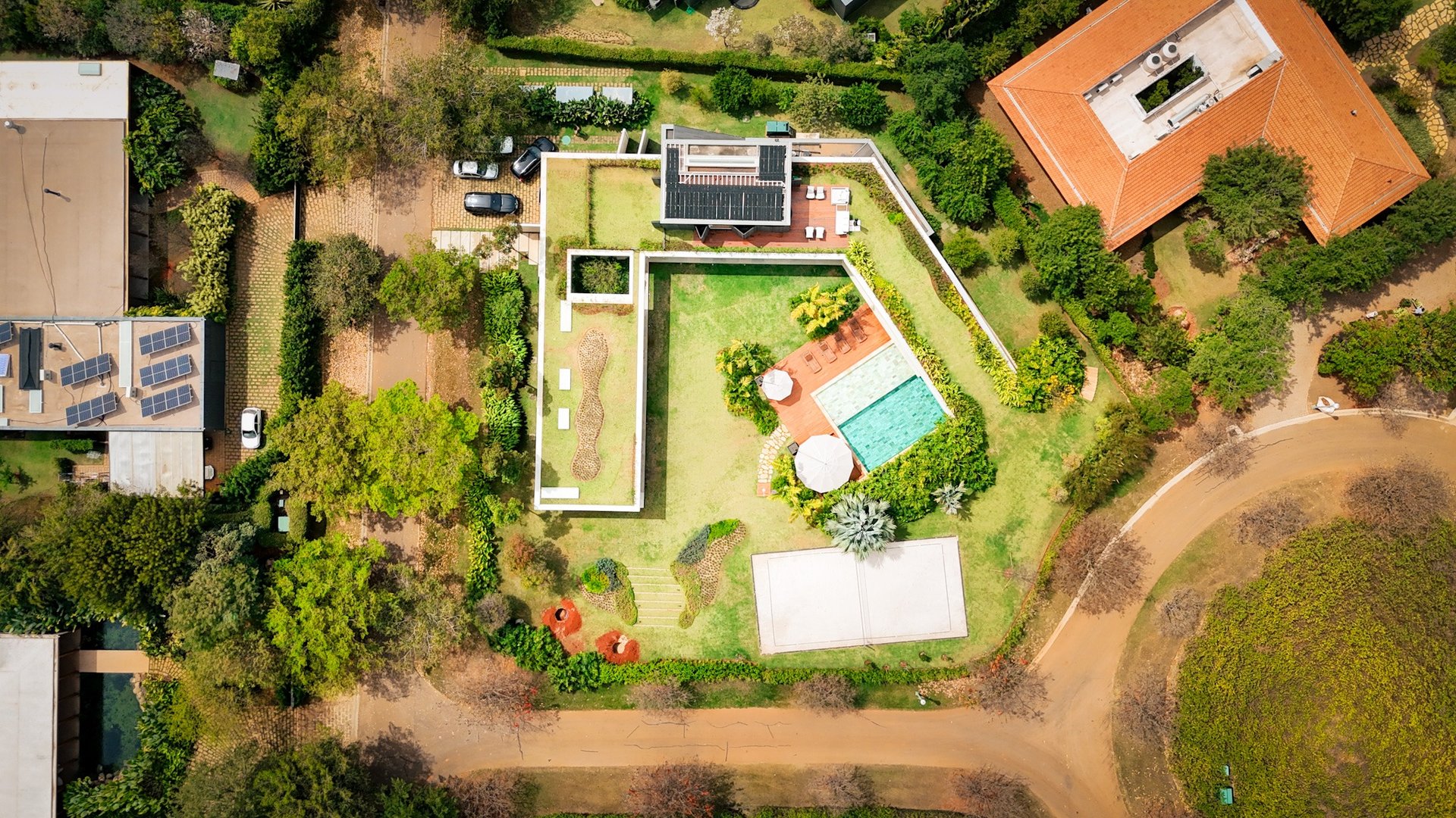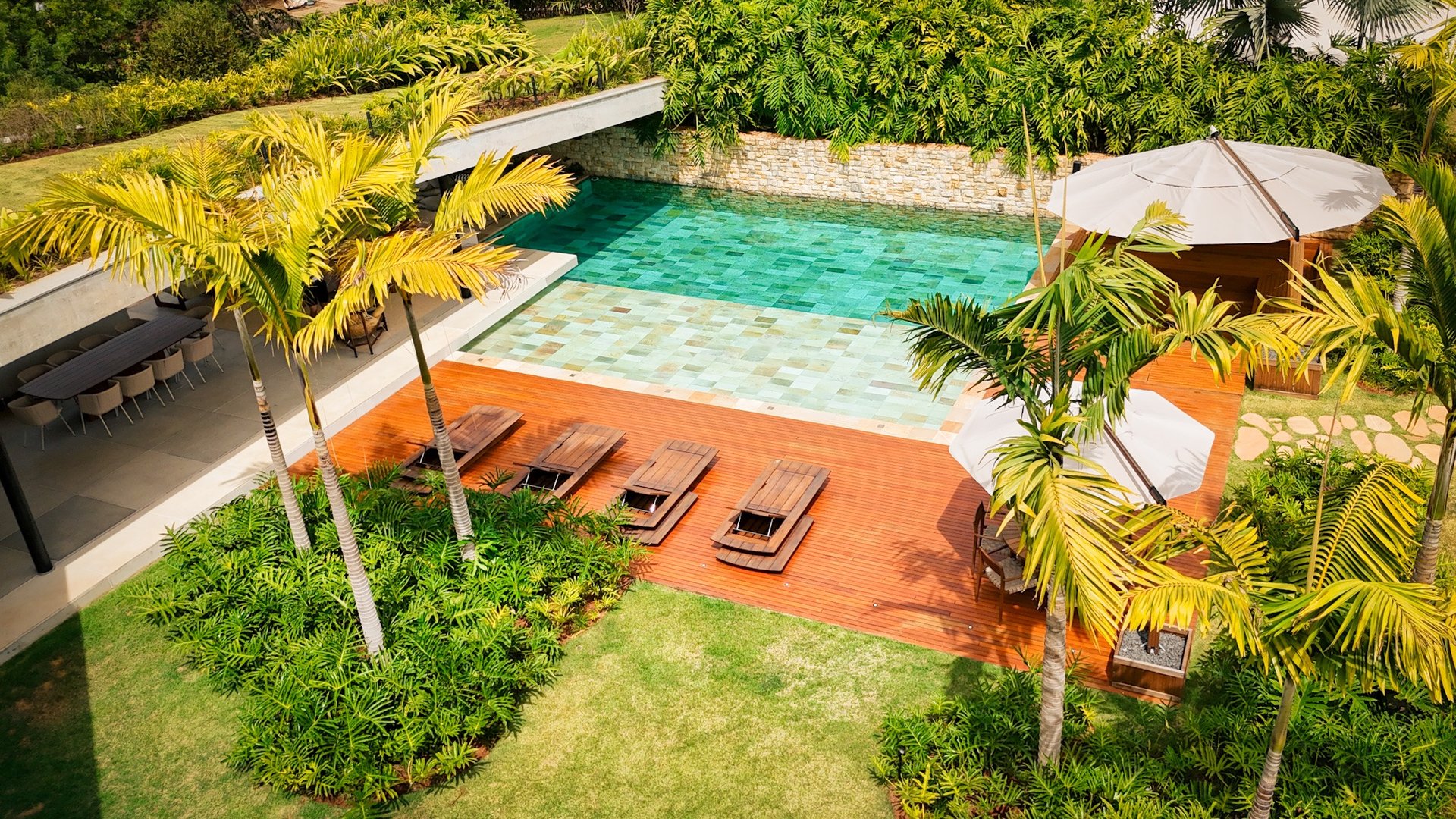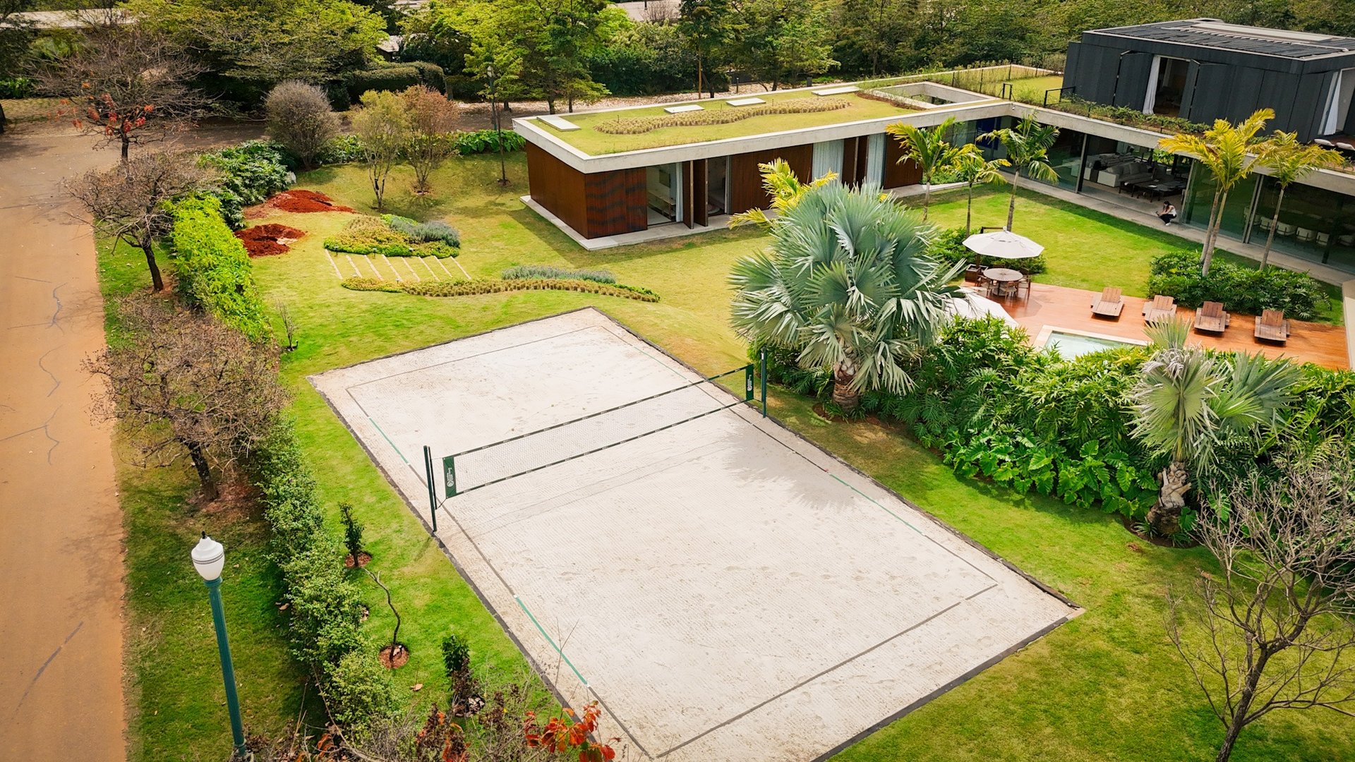 As áreas sociais integradas proporcionam um convívio sofisticado e acolhedor, enquanto a cozinha privativa e a área gourmet completam a experiência de funcionalidade e lazer. O projeto se conecta harmoniosamente ao exterior, onde se destacam a piscina, a quadra de beach tennis e um amplo jardim com paisagismo exuberante.