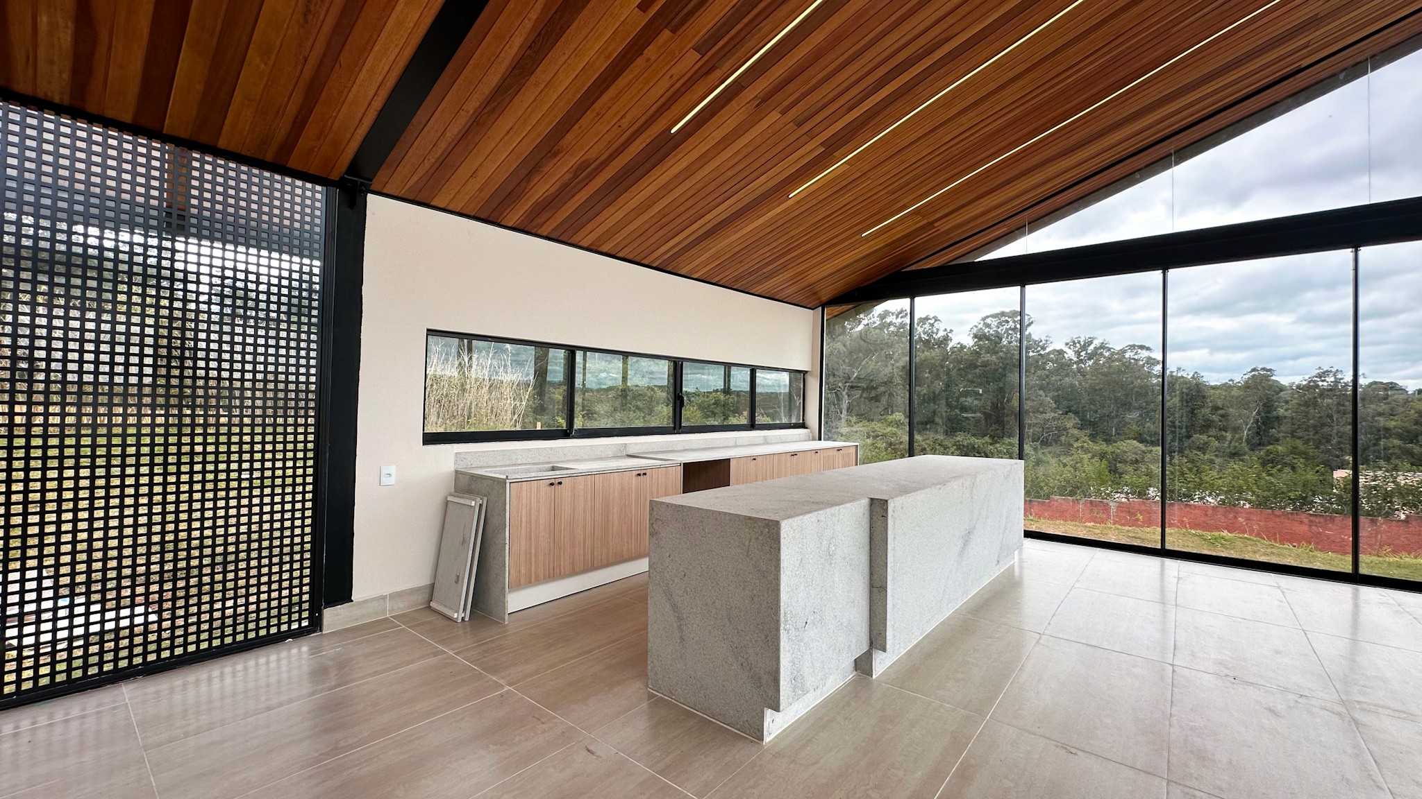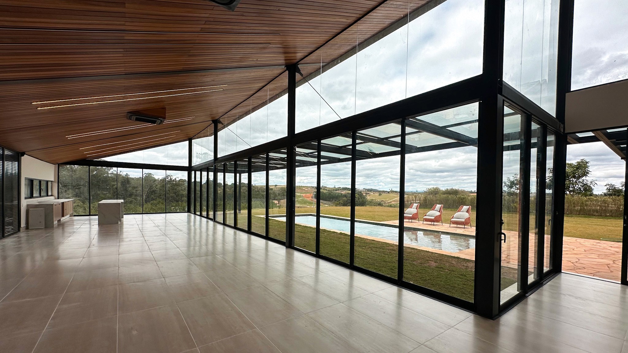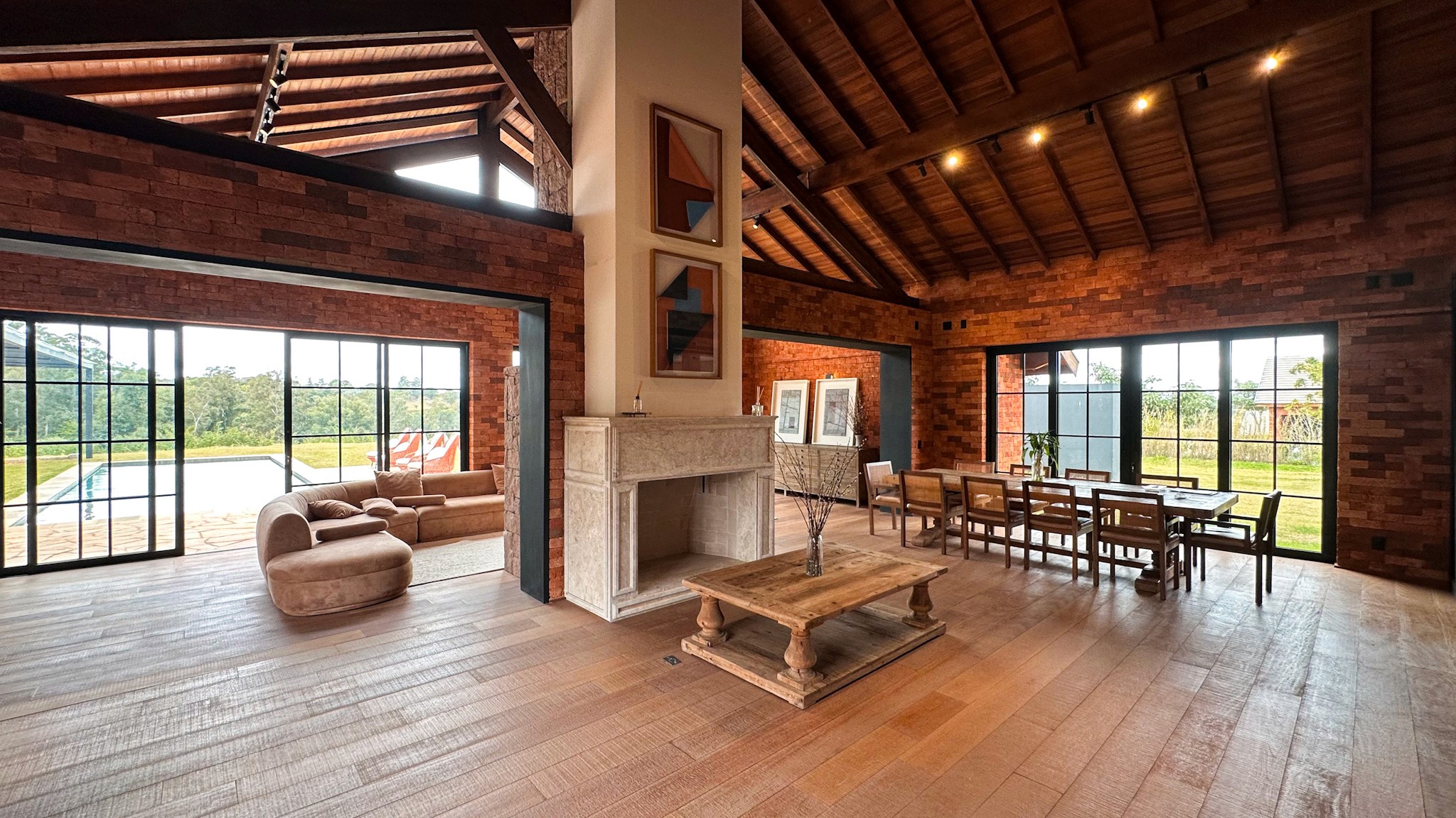 Os ambientes foram cuidadosamente projetados para oferecer conforto e fluidez, com grandes aberturas que proporcionam abundante iluminação natural. A área social conta com sala de estar em dois ambientes com lareira, sala de TV e uma cozinha completa com ilha e despensa, conectadas de forma harmônica à área gourmet — equipada com churrasqueira, lareira e um cenário perfeito para receber.