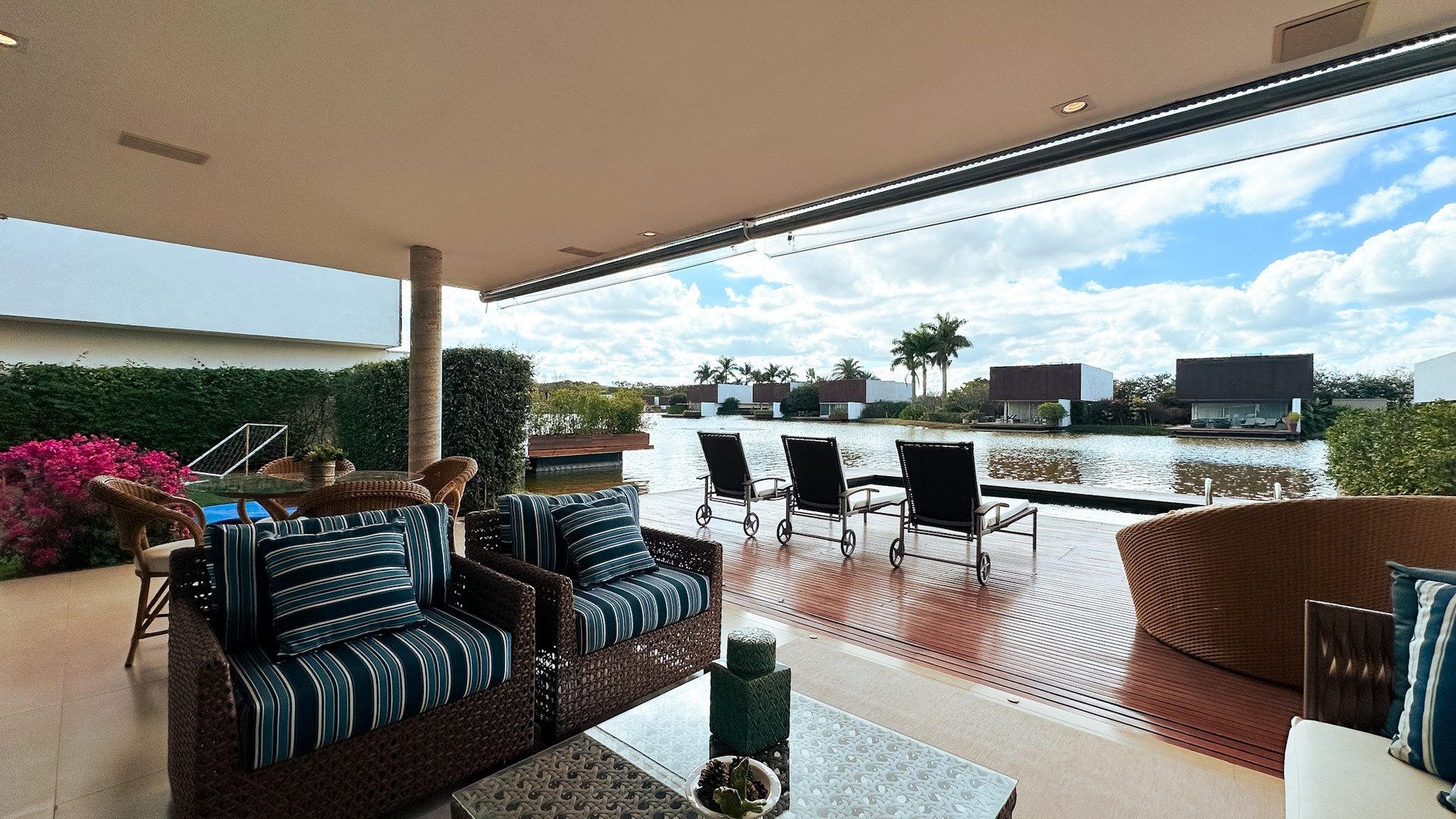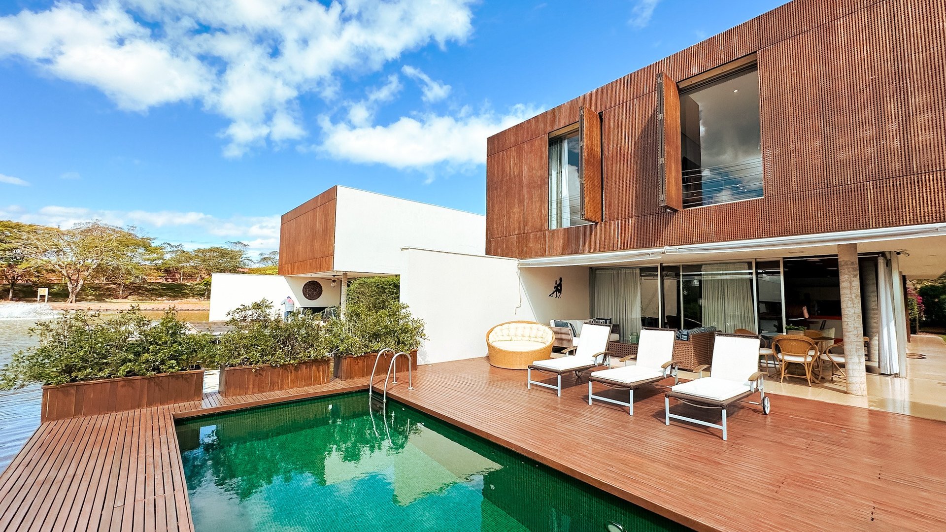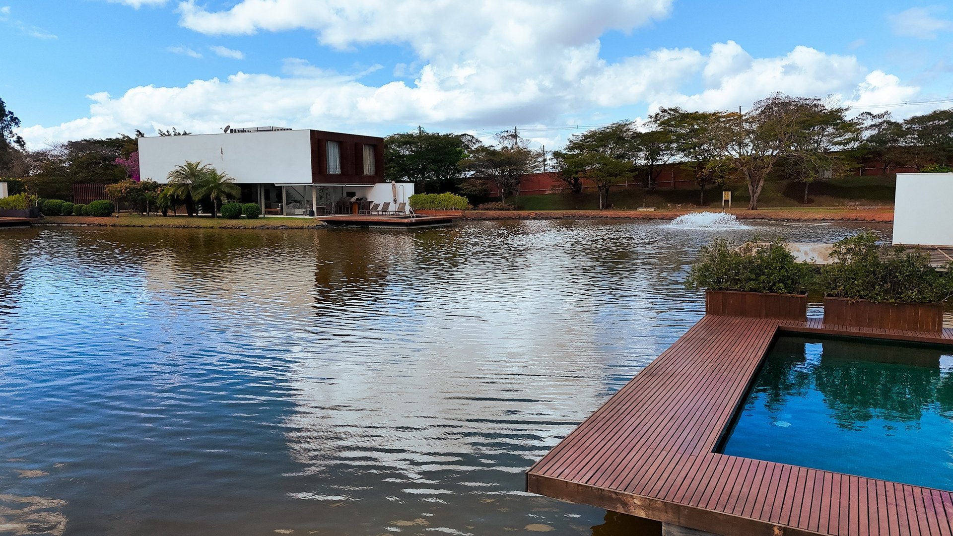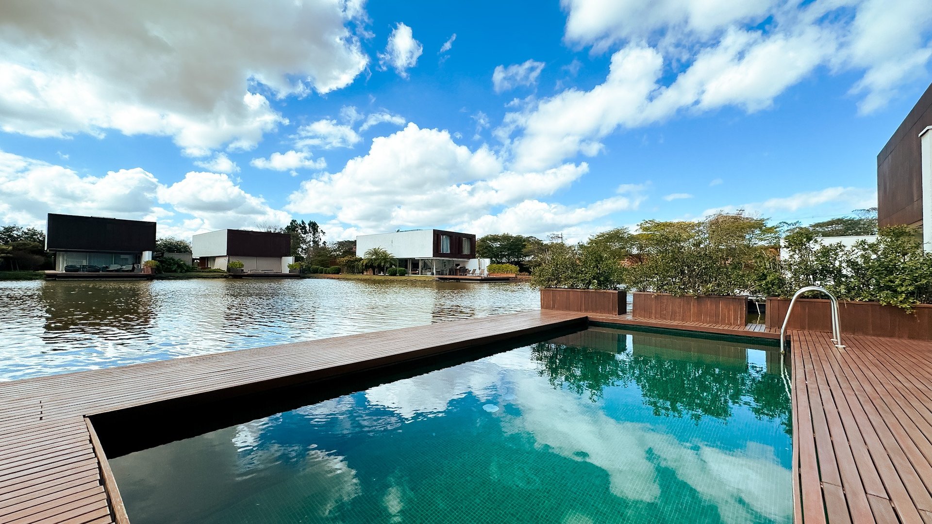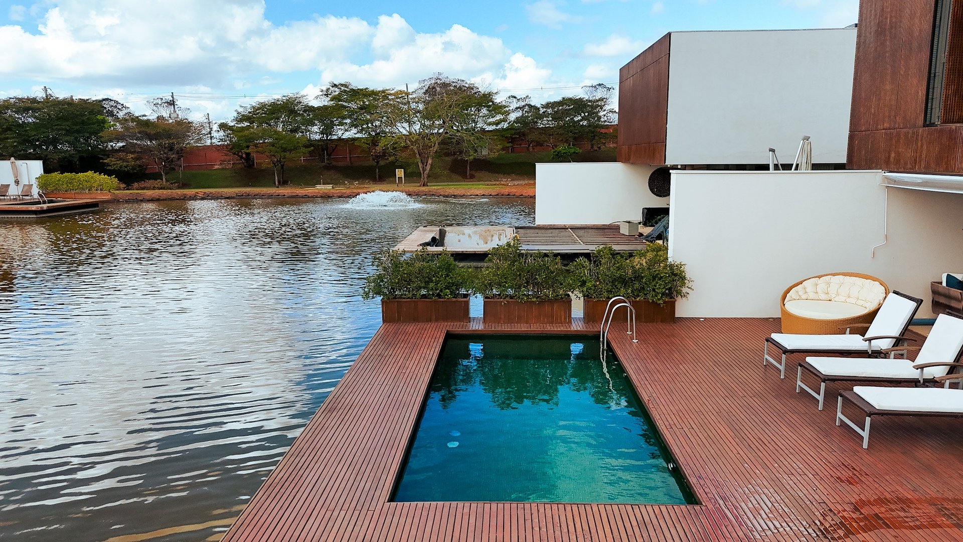 A área externa é um verdadeiro refúgio: jardins cuidadosamente projetados, piscina rodeada de verde e varandas espaçosas que oferecem vista privilegiada para o lago e para o pôr do sol.