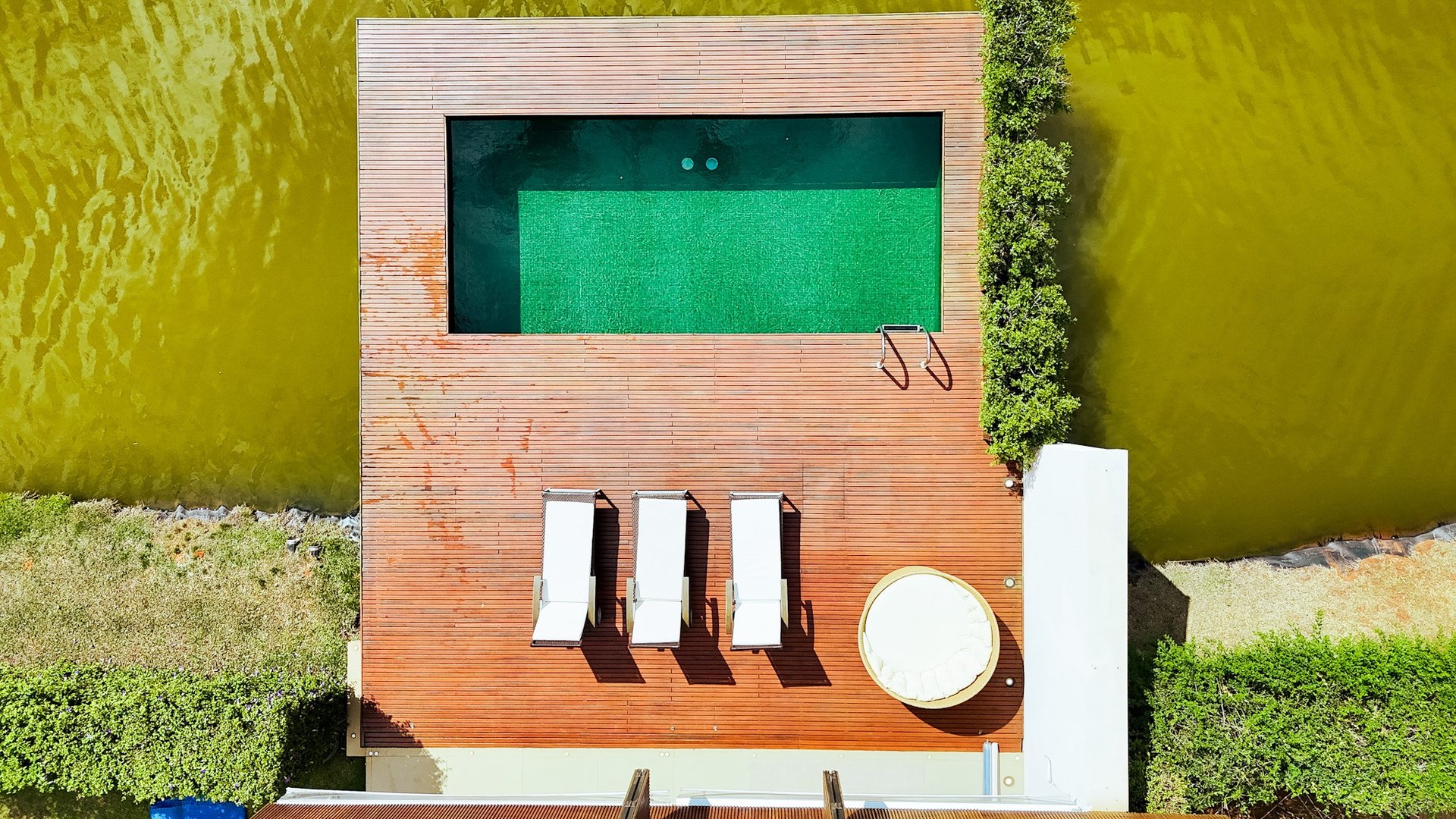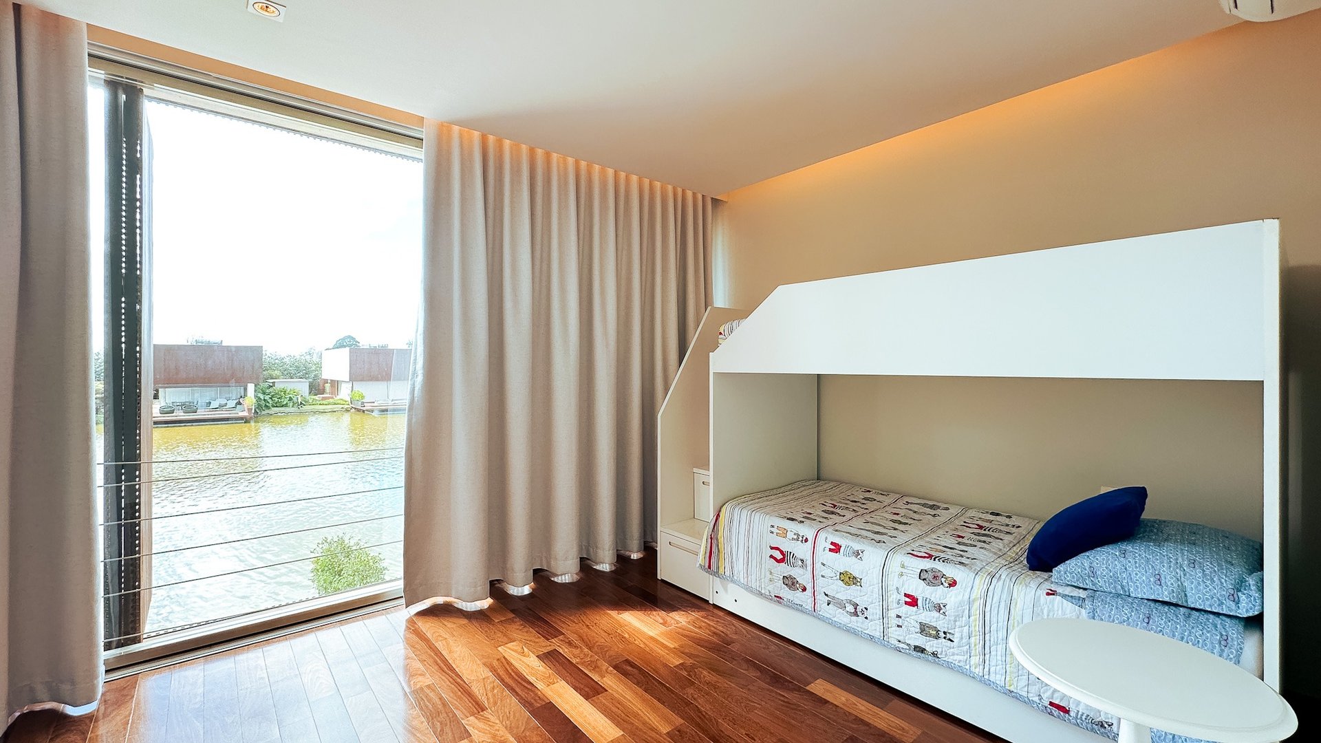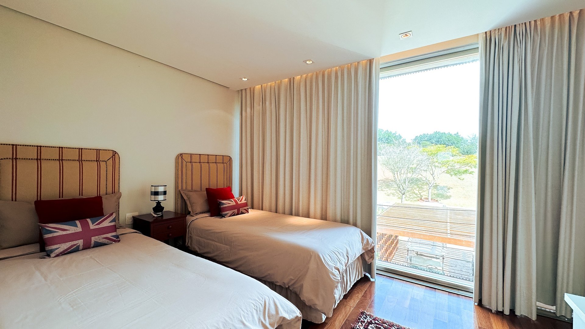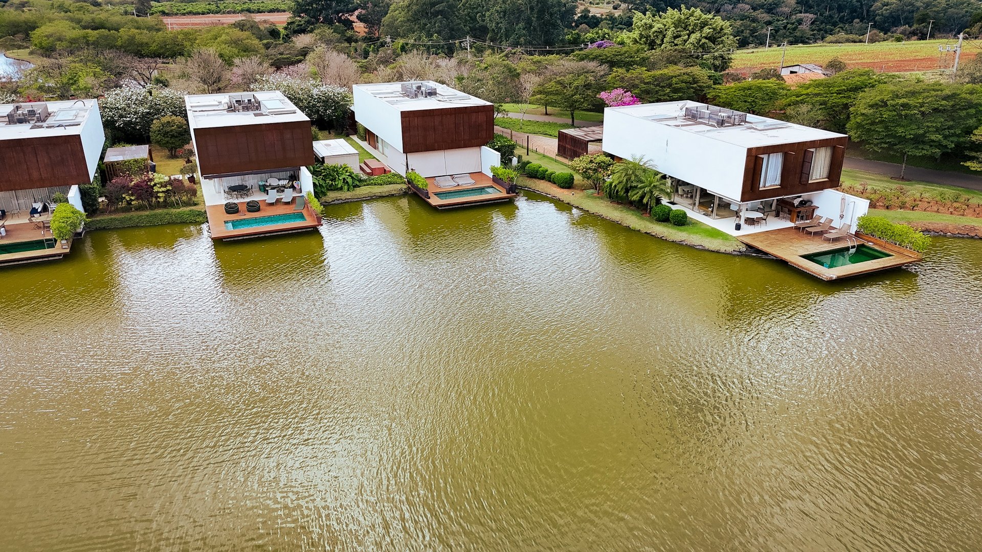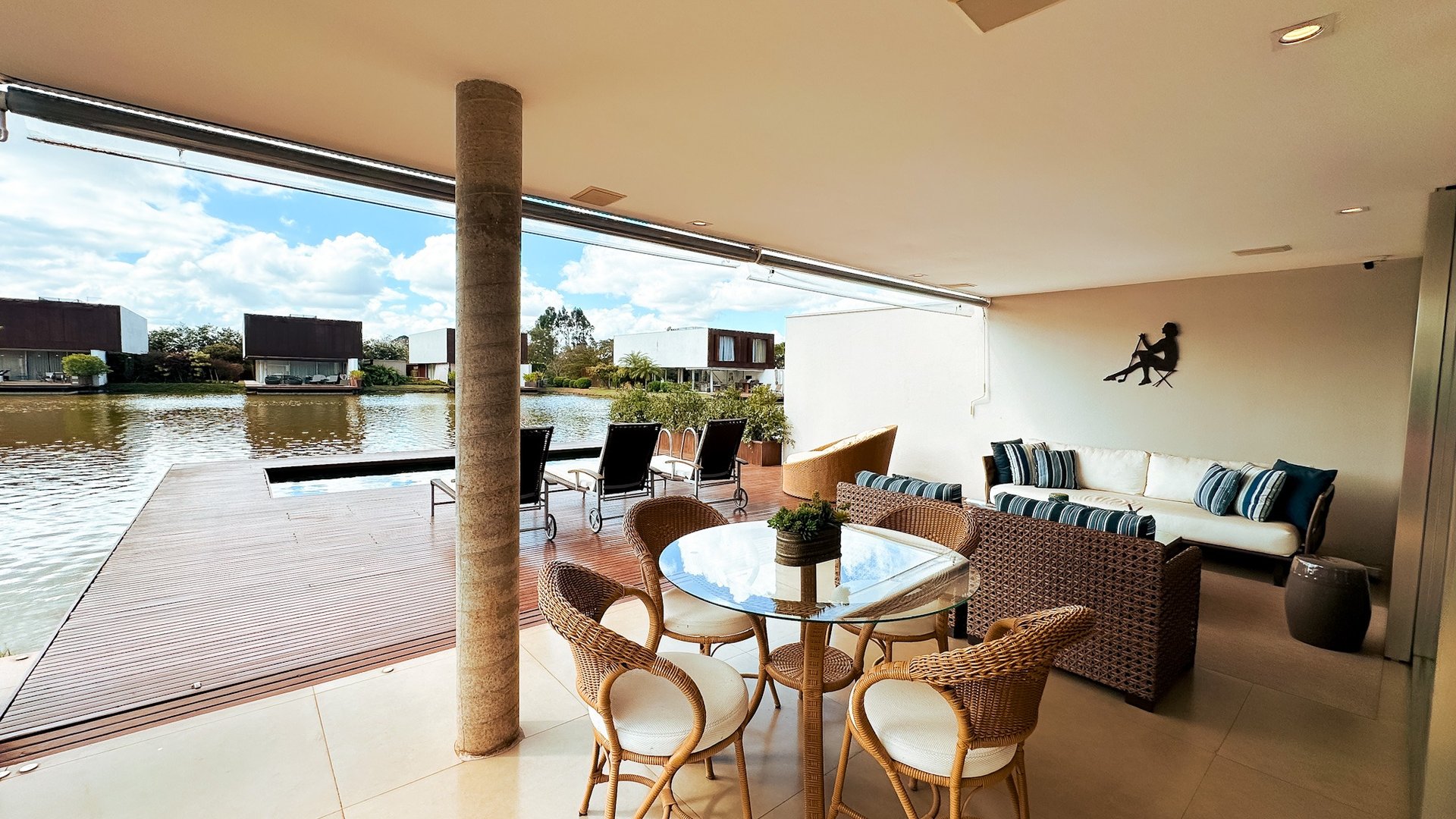 A área externa é um verdadeiro refúgio: jardins cuidadosamente projetados, piscina rodeada de verde e varandas espaçosas que oferecem vista privilegiada para o lago e para o pôr do sol.