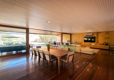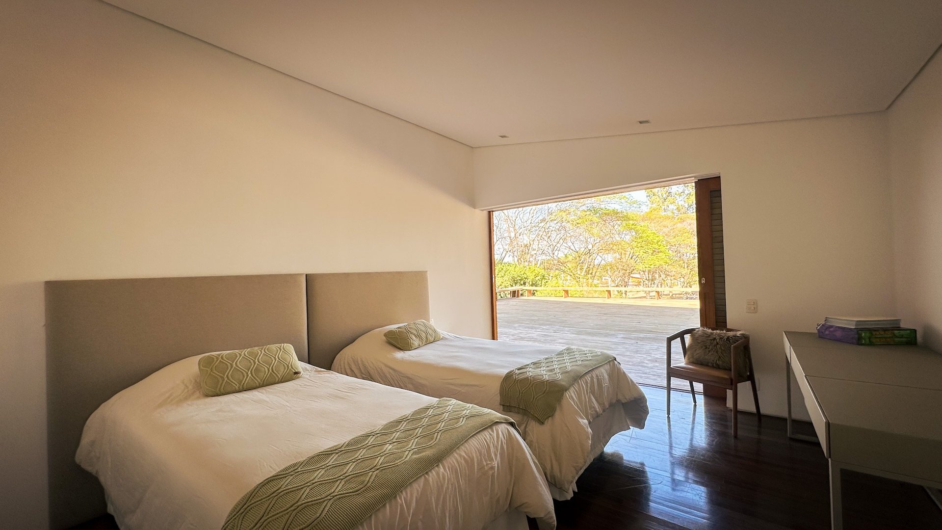 Com 4 dormitórios suítes e um quarto adicional para funcionários equipado com duas camas beliche, acomodações são amplas e confortáveis. A sala de estar e a sala de jantar são integradas, proporcionando um espaço aconchegante para reuniões familiares e jantares.